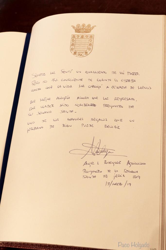 La alcaldesa de la ciudad Dña. Mamen Sanchez, ha recibido esta tarde, en el Ayuntamiento de nuestra ciudad, y junto con el teniente de Alcalde D. Fco. Camas, al pregonero de la próxima Semana Santa 2019, D. Ángel Luis Rodríguez Aguilocho. El acto ha concluido con la firma en el libro de Oro de la Ciudad del Pregonero, quién ha estado acompañado por el Presidente del Consejo D. Dionisio Díaz, miembros del Consejo Local de Hermandades y Cofradías, su presentador y su Hermano Mayor de la Hermandad de la Soledad.